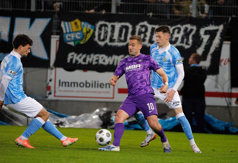Ehlers hätte kurz danach erhöhen können, scheiterte aber an Adamczyk im CFC-Tor (72.). Die Hausherren mussten nun mehr riskieren, wodurch Aue die Räume zum Kontern bekam. Einen solchen nutzten die Veilchen in der zweiten Minute der Nachspielzeit in einer 4-gegen-1-Situation zum 2:0 – wieder war Bär der Torschütze, der frei vor Adamczyk alles klarmachte. Während Fabisch anschließend Gelb-Rot sah (90.+3), verpasste Simnica gar noch das 3:0 (90.+4). Im Finale wartet am 23. Mai nun der FSV Zwickau.