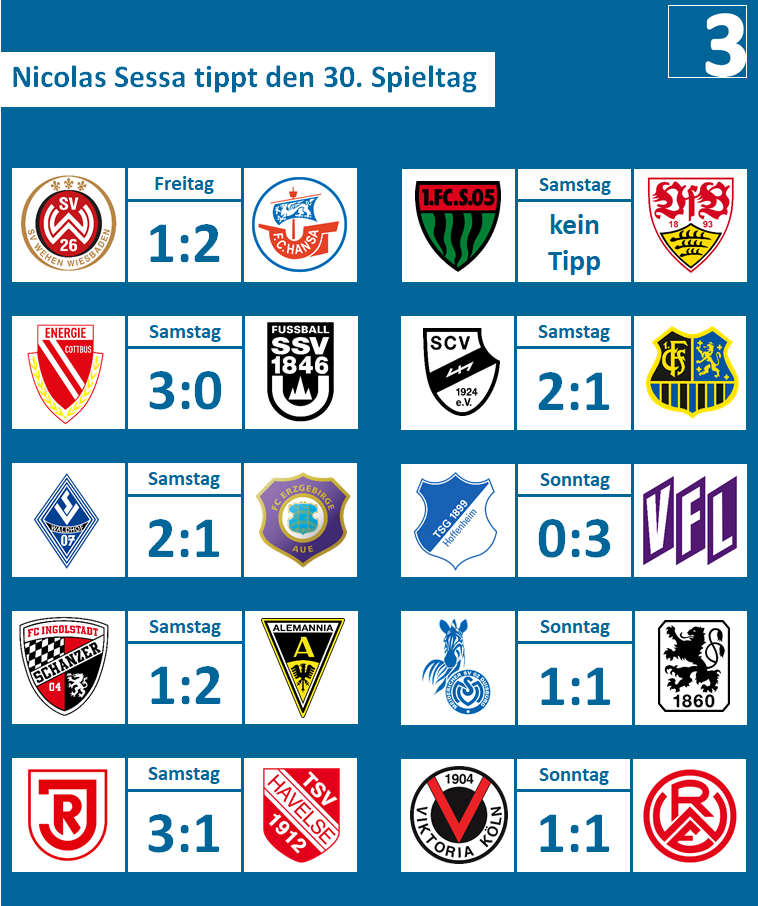 Bevor der Ball wieder rollt, tippt bei liga3-online.de ein Drittliga-Akteur die Partien des Spieltages. Am 30. Spieltag stellt sich Nicolas Sessa von VfB Stuttgart II dieser Herausforderung.
