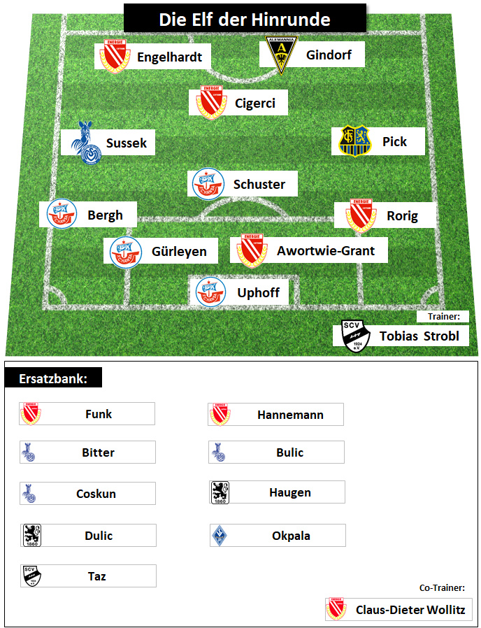 Im offensiven Mittelfeld fiel die Wahl auf Tolcay Cigerci von Energie Cottbus, der mit zwölf Toren und zehn Vorlagen der Topscorer der Liga ist. Auch Top-Torjäger Erik Engelhardt (Energie Cottbus) hat es mit 13 Toren in die Elf geschafft, genau wie Lars Gindorf von Alemannia Aachen, der in 16 Spielen zwölfmal traf. Trainer der Mannschaft ist Verl-Coach Tobias Strobl, der mit dem Sportclub trotz eines erneuten XXL-Umbruchs im Sommer derzeit auf Platz 2 steht.