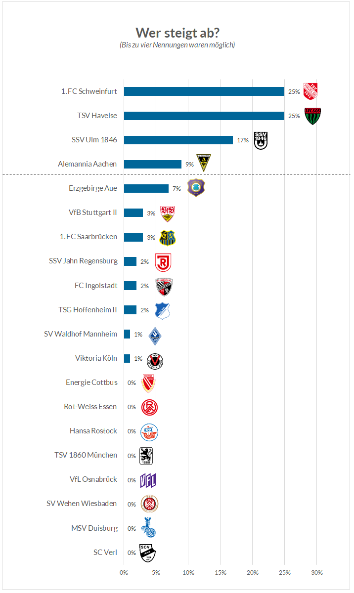 Geht es nach den Lesern, steigen der 1. FC Schweinfurt und der TSV Havelse (beide 25 Prozent) direkt wieder ab. Bereits vor der Saison waren beide Klubs als Absteiger nominiert worden, die schwache Hinrunde bestätigte die Einschätzung anschließend. Während Schweinfurt nur sechs Zähler sammeln konnte und bereits 16 Punkte hinter dem rettenden Ufer liegt, steht Havelse bei 13 Punkten.