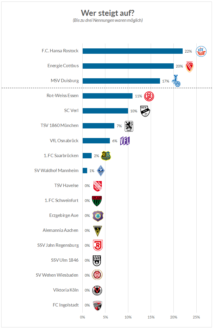 Bevor am kommenden Wochenende die Rückrunde startet, wollten wir von Euch wissen: Wer steigt auf und wer muss runter? Das Ergebnis: Rostock, Cottbus und Duisburg steigen auf – Schweinfurt, Havelse, Ulm und Aachen müssen in die Regionalliga.