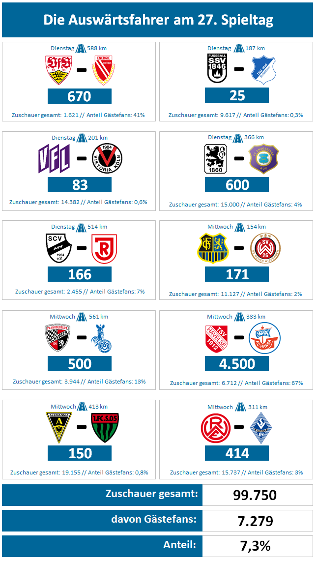 Wie viele Auswärtsfahrer am 27. Spieltag in den Stadien waren
